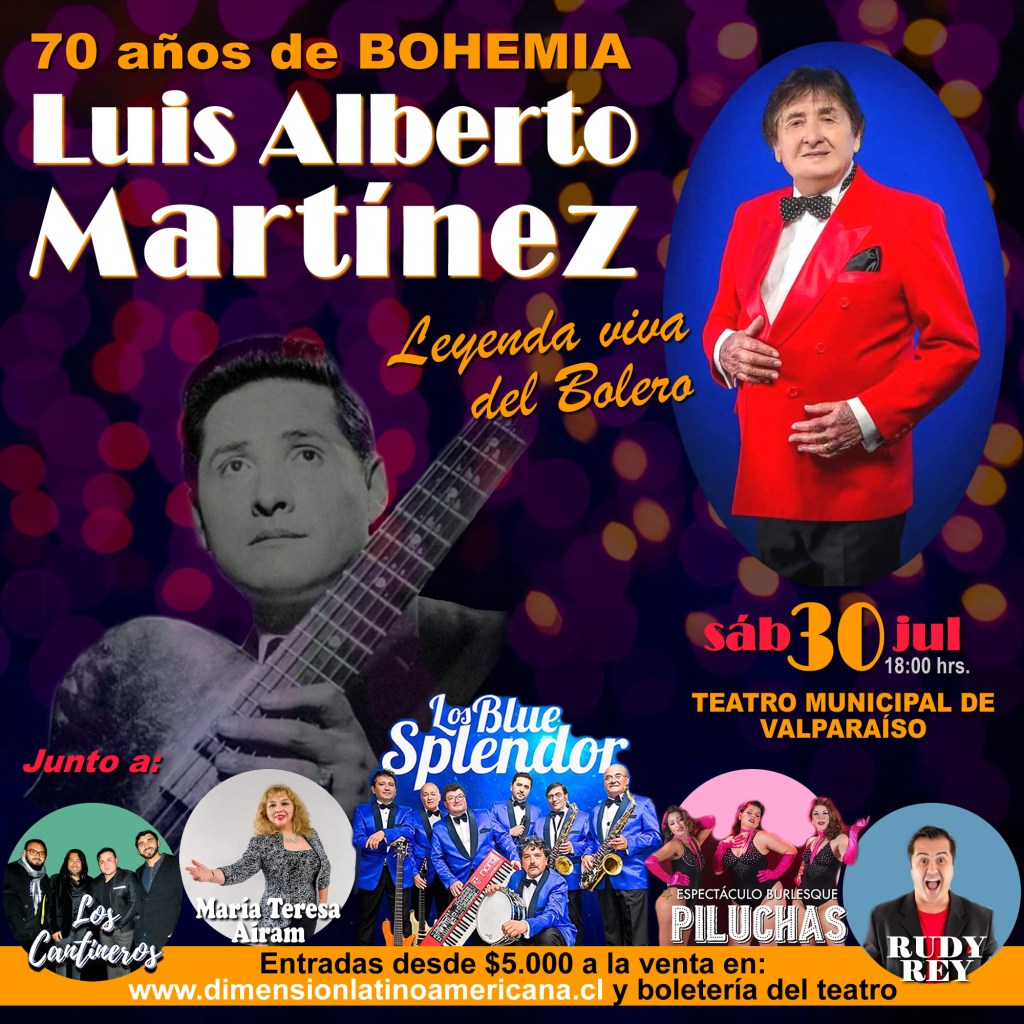 Acompáñenos a celebrar los 70 años de trayectoria artística de nuestra leyenda viva del bolero, Luis Alberto Martínez, quien estará acompañado por Los Blue Splendor, María Teresa Airam, Los Cantineros, Rudy Rey y el espectáculo burlesque «Piluchas» para rememorar lo mejor de la bohemia porteña de antaño.