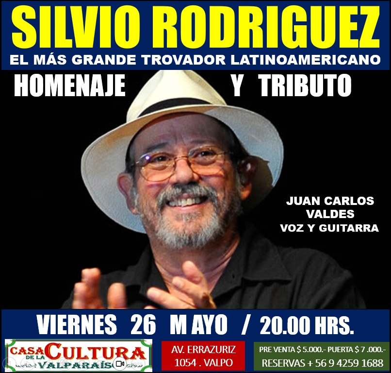 Casa de la Cultura de Valparaiso Juan Carlos Valdés: Tributo a Silvio Rodríguez – VIE/26/MAYO Publicado por editor el 14/05/202306/06/2023 Homenaje y tributo a Silvio Rodríguez en la voz y guitarra de Juan Carlos Valdés Casa de la Cultura de Valparaíso VIE/26/mayo 20:00 hrs. Preventa $5.000 (Whatsapp +569 4259 1688) / Puerta $7.000 Compartir: Compartir en WhatsApp (Se abre en una ventana nueva) WhatsApp Compartir en X (Se abre en una ventana nueva) X Comparte en Facebook (Se abre en una ventana nueva) Facebook Compartir en Telegram (Se abre en una ventana nueva) Telegram Enviar un enlace a un amigo por correo electrónico (Se abre en una ventana nueva) Correo electrónico Imprimir (Se abre en una ventana nueva) Imprimir Me gusta Cargando... Related