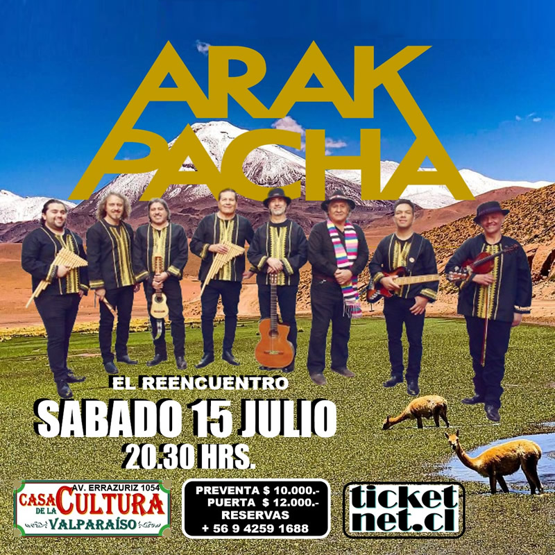 Arak Pacha, una de las agrupaciones chilenas más originales en la difusión de la cultura andina a nivel nacional, celebrará en la Casa de la Cultura Valparaíso, con sus integrantes originales, sus 40 años de trayectoria presentando su aplaudido concierto “Por los senderos del indio”, basado en su cantata indigenista homónima de defensa de las comunidades andinas del altiplano chileno, su cultura, su cosmovisión y el medio ambiente.