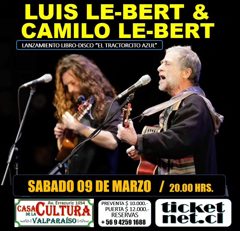 El cantautor y guitarrista Luis Le-Bert regresa al centro cultural porteño junto a su hijo Camilo para lanzar su libro-disco «El tractorcito azul» en homenaje a Camilo Catrillanca, y hacer un recorrido por su extensa discografía.
